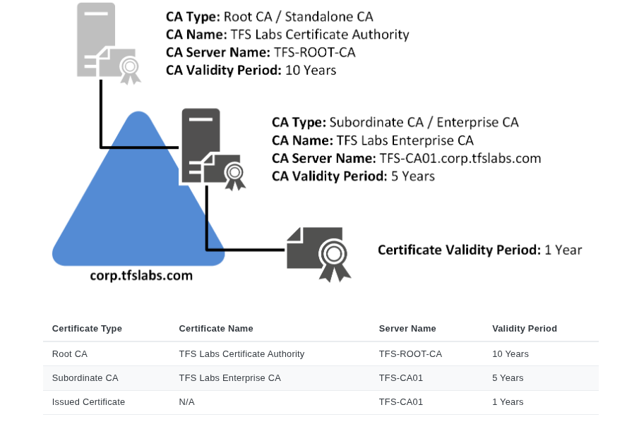 Certificate Authorities (CAs) issue digital certificates and confirm the identity of the certificate holder. CAs can either operate independently or be integrated with Active Directory as Enterprise CAs. In a Windows Active Directory (AD) environment, several services and features utilize certificate-based authentication for secure login and encryption. Some routine use cases: